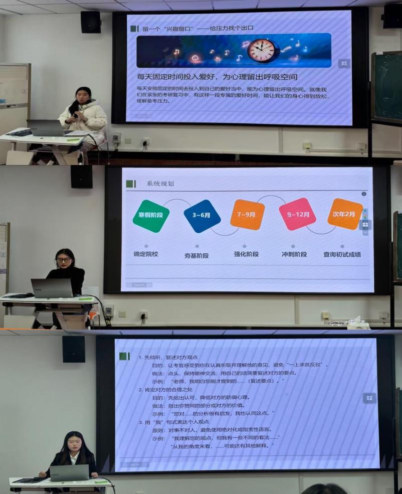 研究生分享环节同样亮点纷呈。陈姝亭结合自身经历,讲述应对升学焦虑与挫折的真实故事,传递积极备考心态;丛格飞以周为单位展示个人备考时间规划表,细致讲解如何平衡课程学习、考研复习进度与休息时间分配;张爽聚焦复试细节,分享了礼貌表达不同意见、将陌生问题引向熟悉领域的实用技巧。