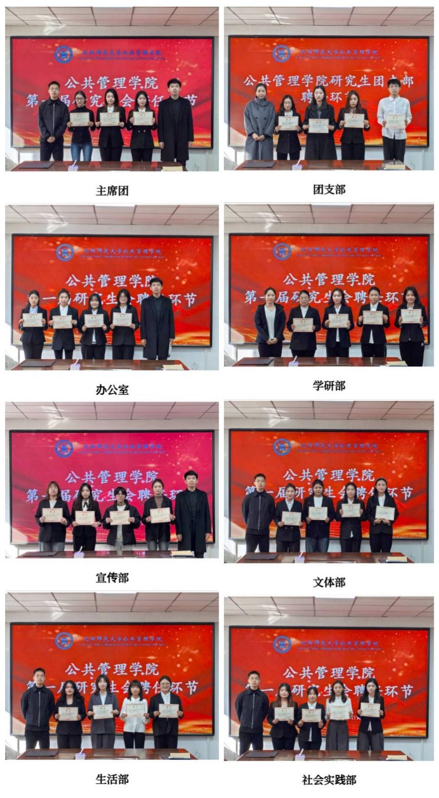 公共管理学院第一届研究生会及团支委聘任大会圆满结束。本次聘任大会不仅完成了研究生会工作的顺利交接,更明确了新一届研究生会的工作方向与纪律要求。相信在老师们的指导下,新一届研究生会成员将以饱满的热情、务实的作风开展工作,切实发挥“学院与学生间桥梁纽带”的作用,为公共管理学院的发展贡献青春力量。